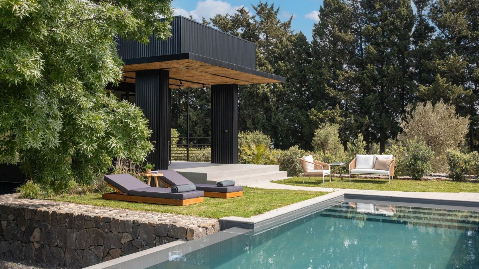 The private garden features a furnished veranda, sun deck and a 30m² infinity pool—perfect for relaxing in nature.